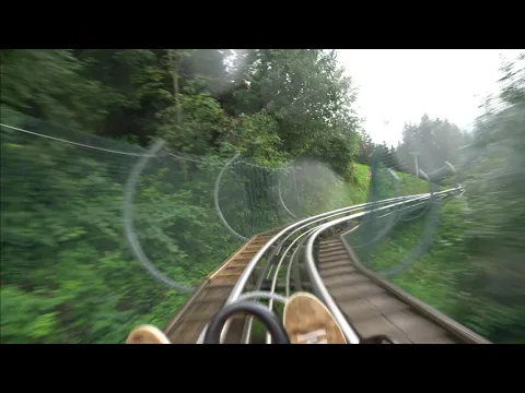 Direkt nach den ersten drei Serpentinen rasen wir bereits über den ersten größeren Jump, welcher den Schlitten schnell auf seine Maximalgeschwindigkeit befördert. Kurze Zeit später fliegen wir ein weiteres Mal über einen Schussfahrt. Nach einer äußerst flotten Passage durch den Wald geht es über mehrere Wellen, die einen gekonnt aus der Sitzschale reizen und einen dabei ein wenig durchschütteln. Mit einem fetten Grinsen auf dem Gesicht folgen mehrere steilere Kurvenpassagen, die zwischendurch immer wieder durch Wellen und Jumps unterbrochen werden. Nach einigen ruhigeren Passagen (die bei anderen Anlagen bereits ein Highlight darstellen) geht es dann ab 1:01 wieder ordentlich zur Sache. Auf einem Jump folgen im schnellen Wechsel einige sehr enge und steile Kurven. Hat man sich auch davon erholt wird ab 1:25 eine sechs sekündige Airtime-Orgie eingeleitet. Nach einer Vielzahl an Serpentinen fügt sich nach 2:15 eine weitere Wellenpassage an. Auch hiernach geht es weiterhin in Serpentinen den Berg hinunter, ehe dann gegen Ende noch eine Helix auf die Mitfahrer wartet.